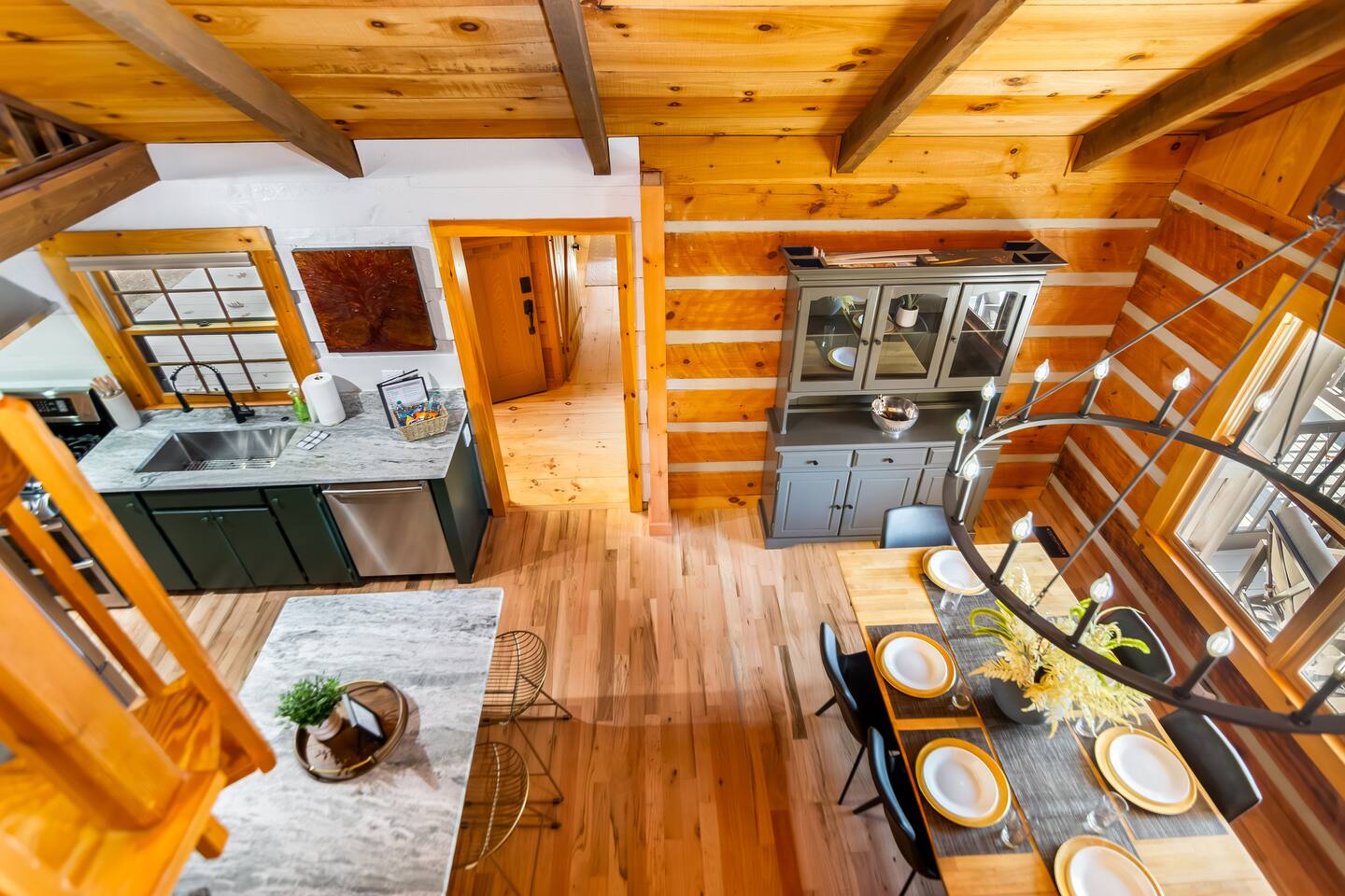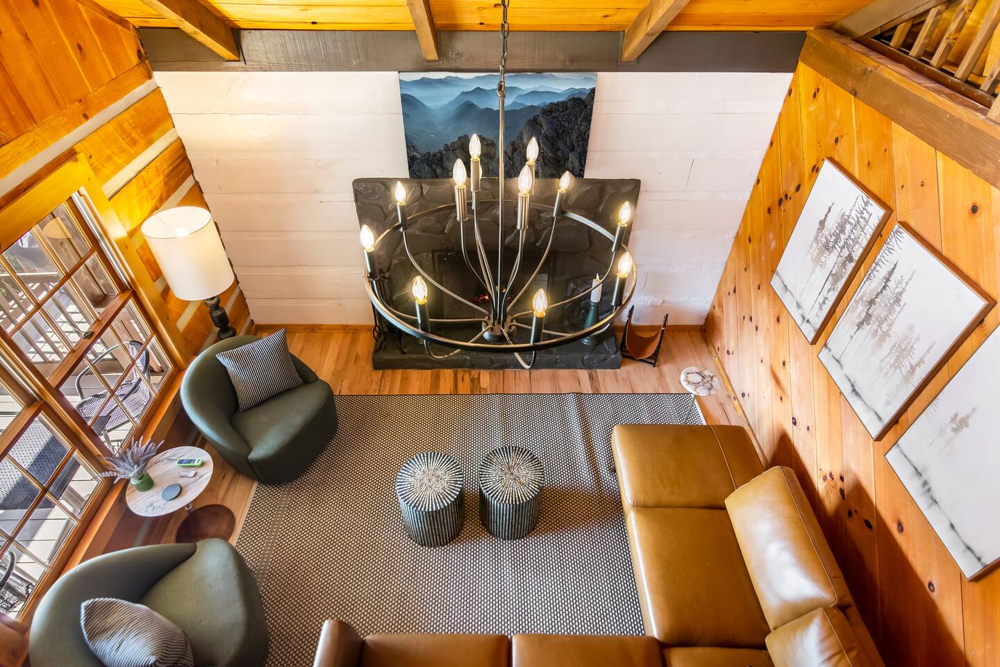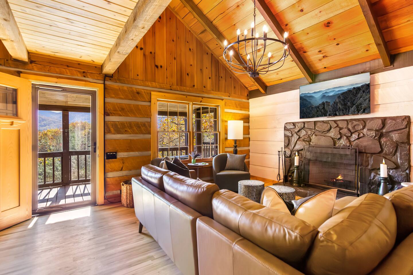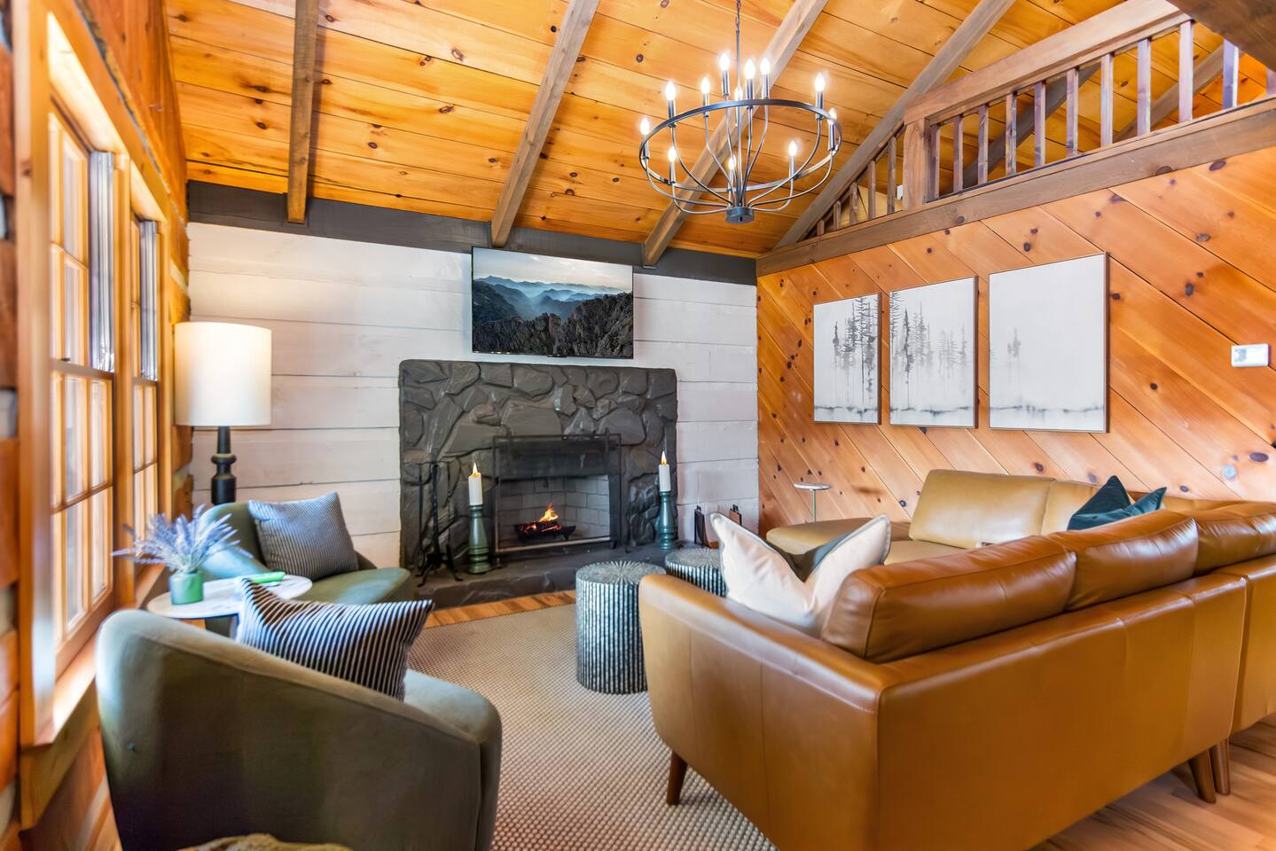 This newly renovated cabin offers 2 bedrooms and 2 baths, ideal for couples or families. The open-concept living area features windows across framing the mountain views, a wood-burning fireplace, and access to expansive decks. Downstairs, enjoy a separate media room as well as a half bath with a 75” Smart TV for movie nights.