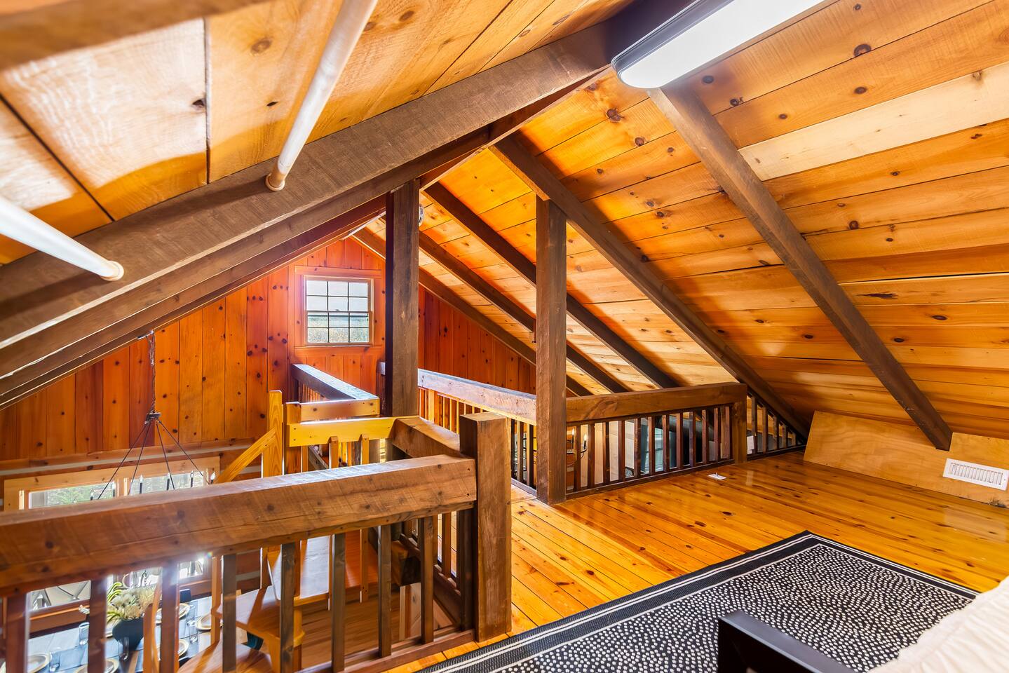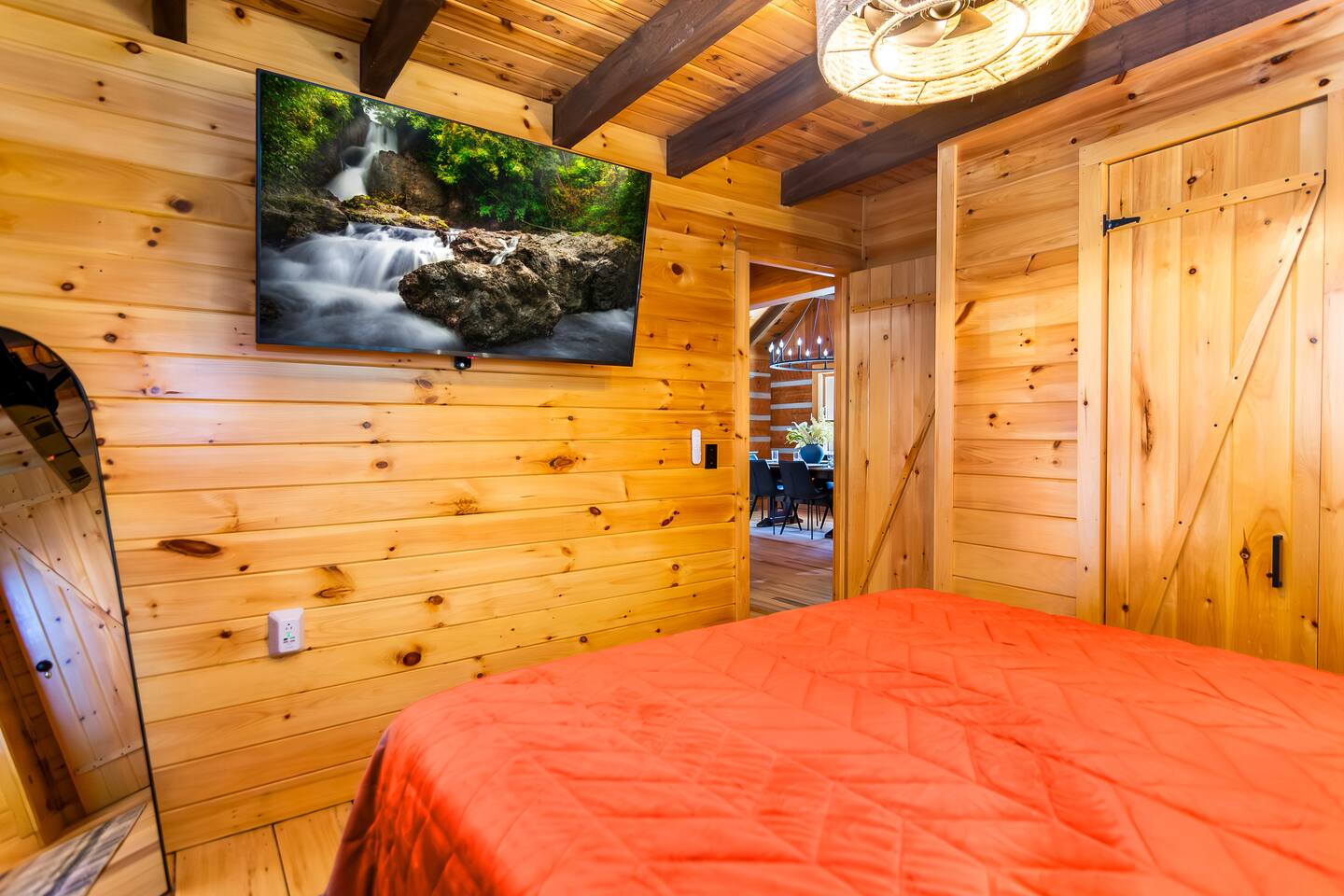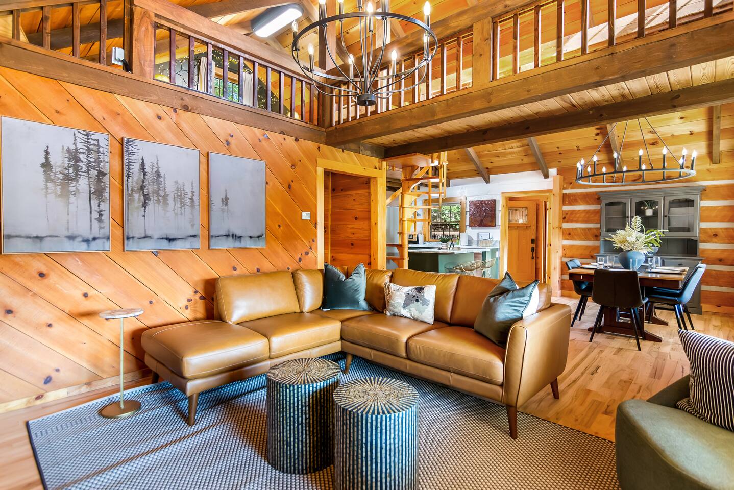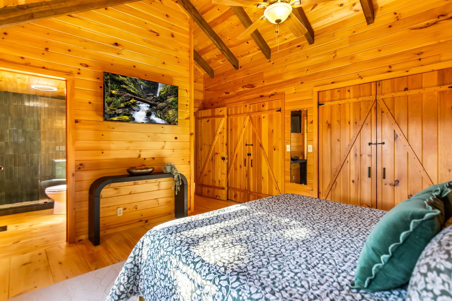 This newly renovated cabin offers 2 bedrooms and 2 baths, ideal for couples or families. The open-concept living area features windows across framing the mountain views, a wood-burning fireplace, and access to expansive decks. Downstairs, enjoy a separate media room as well as a half bath with a 75” Smart TV for movie nights.