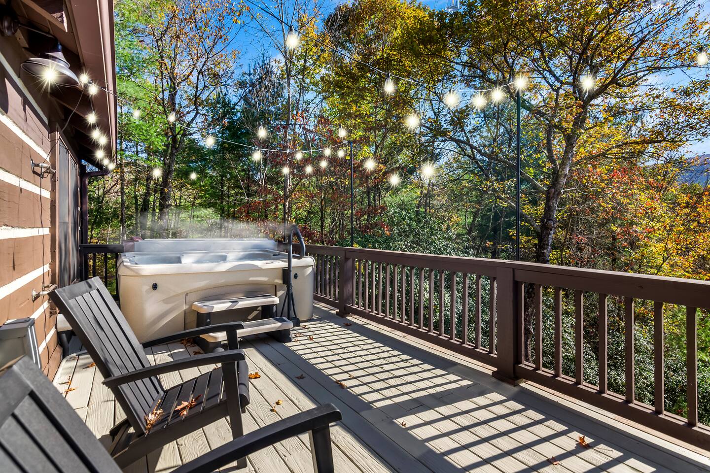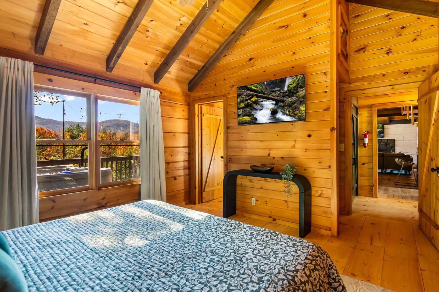 Step outside to multiple decks, a gas fire pit, and a private hot tub overlooking the mountains. Sip coffee at sunrise, grill dinner on the gas BBQ, and end the night with wine by the fire.