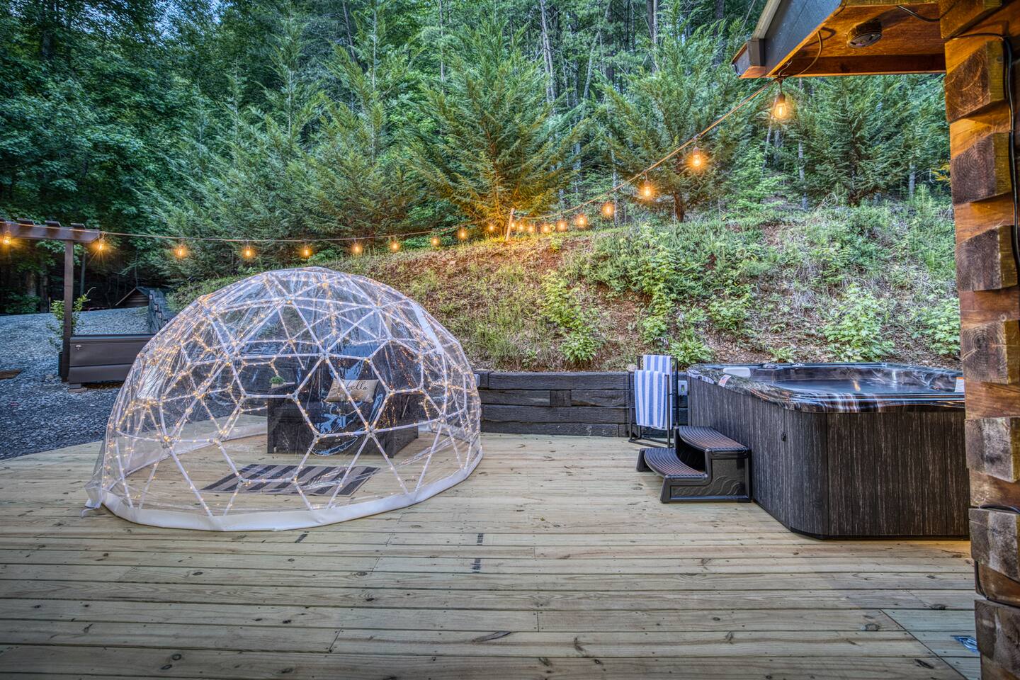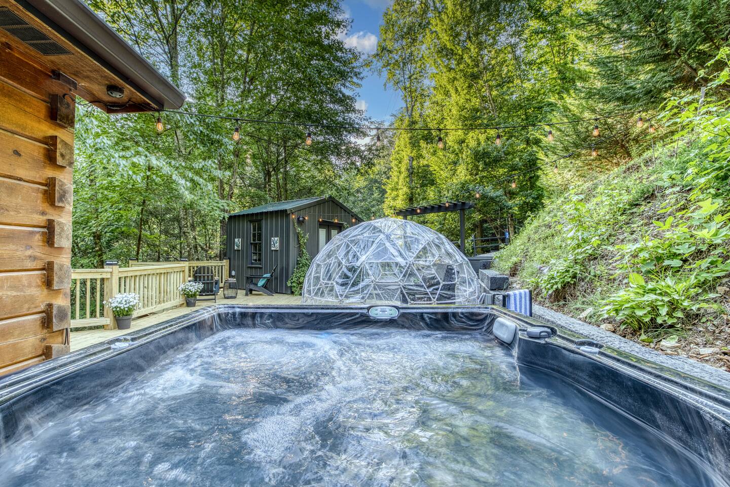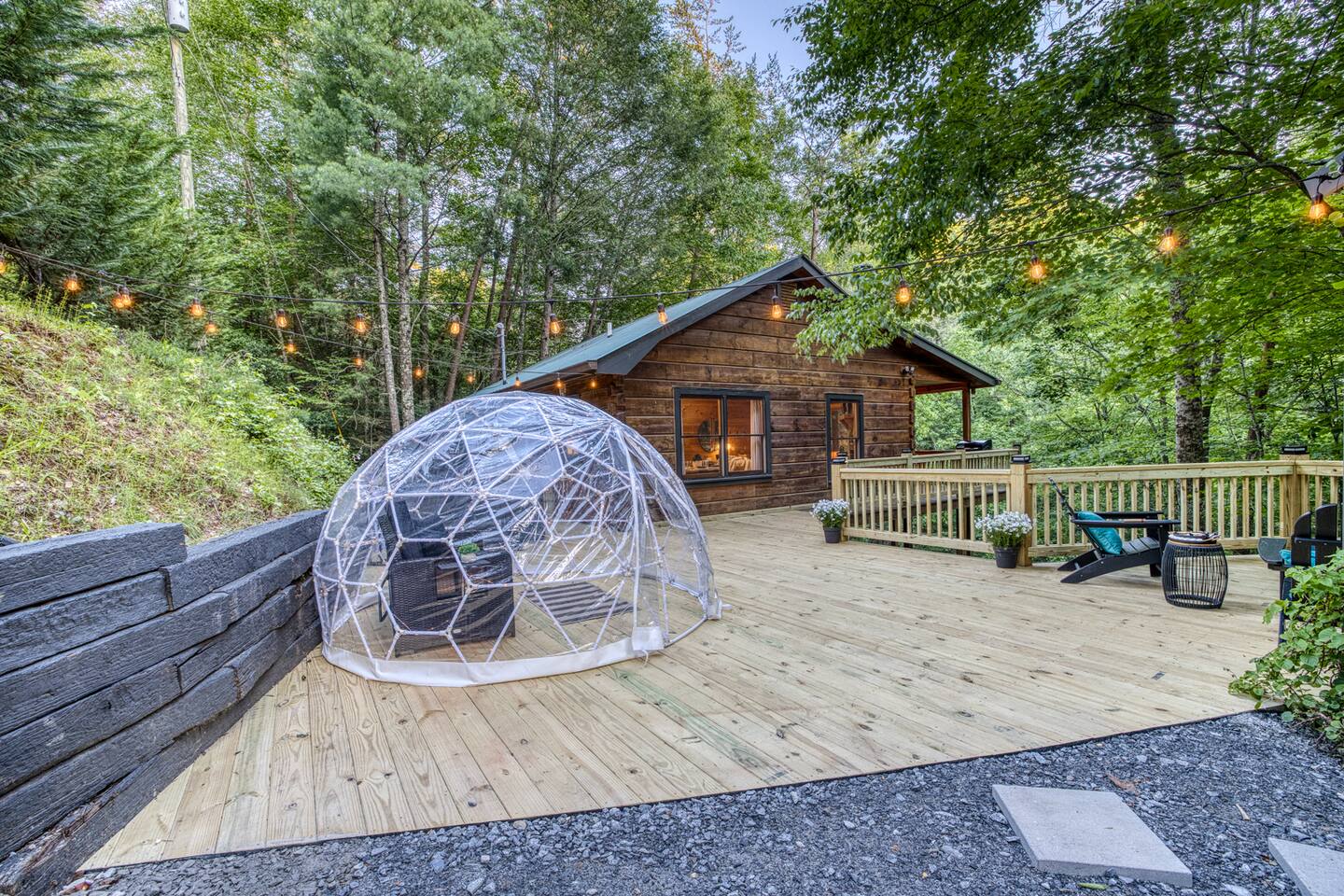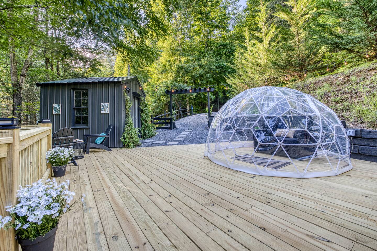 Spend your evenings stargazing from the glowing igloo dome, soaking in the private hot tub, or cuddled up by the crackling Solo Stove firepit. Let the soft murmur of the nearby creek, always audible and visible through the trees, lull you to sleep and gently greet you each morning. Sip coffee from a local roaster or tea on the front porch swing or in the rocking chairs as the forest wakes around you.