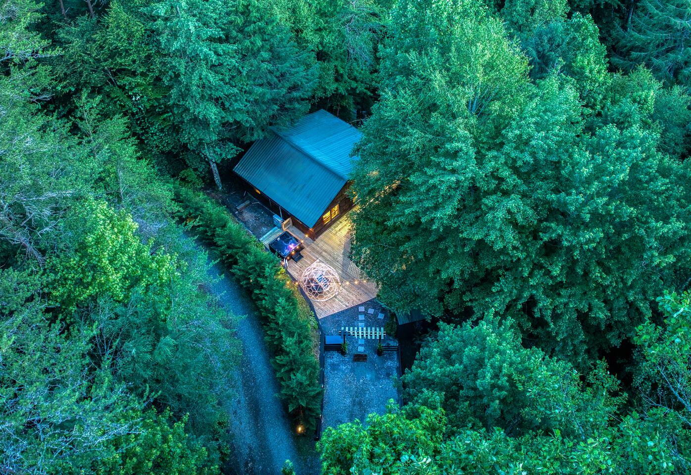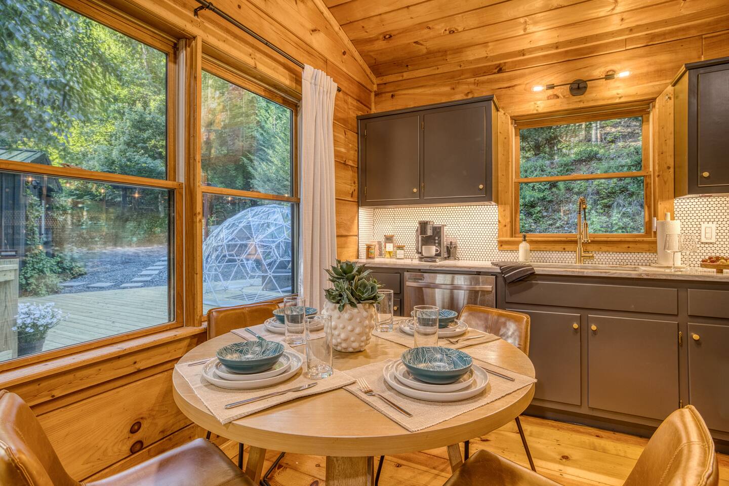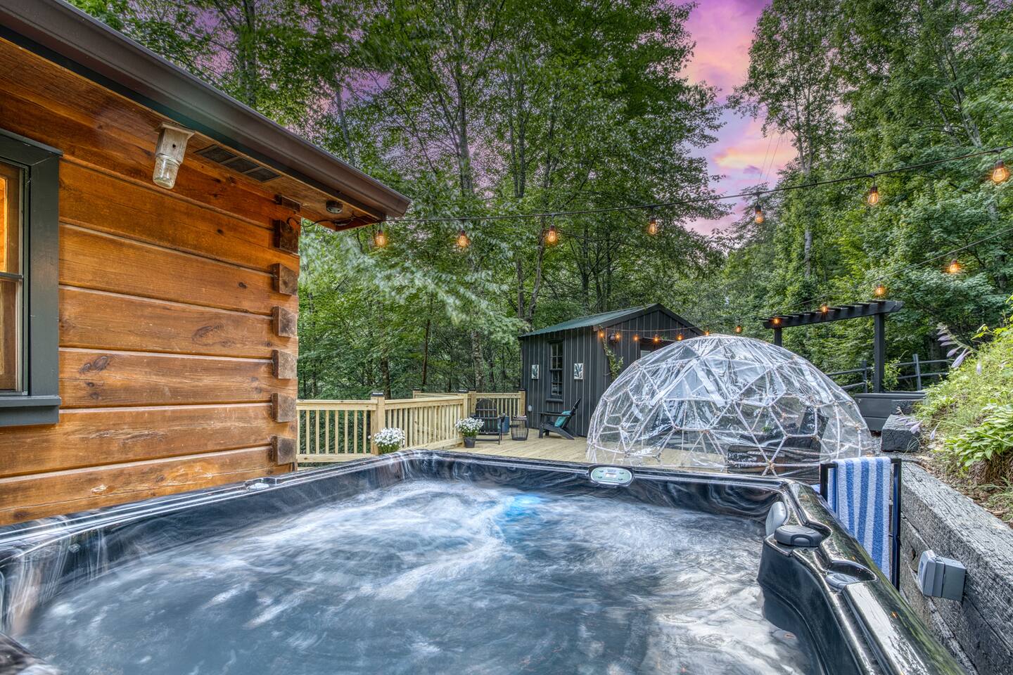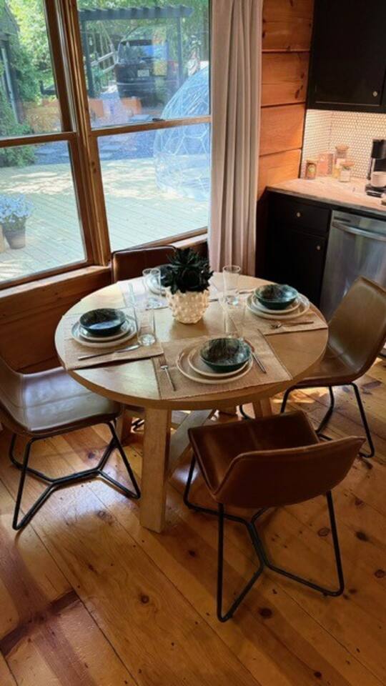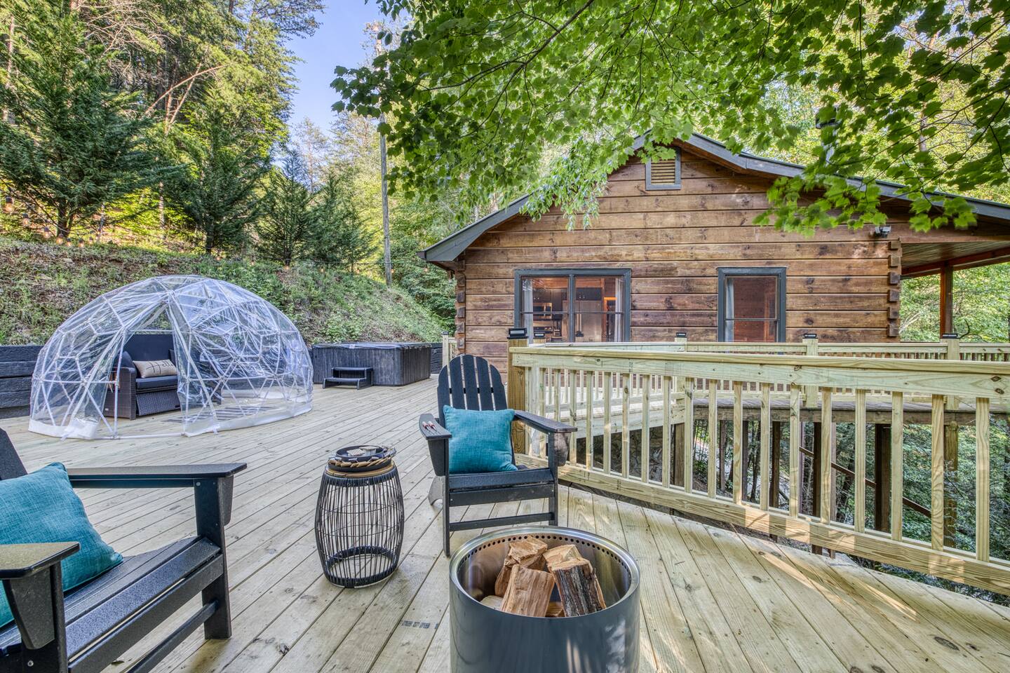 Spend your evenings stargazing from the glowing igloo dome, soaking in the private hot tub, or cuddled up by the crackling Solo Stove firepit. Let the soft murmur of the nearby creek, always audible and visible through the trees, lull you to sleep and gently greet you each morning. Sip coffee from a local roaster or tea on the front porch swing or in the rocking chairs as the forest wakes around you.