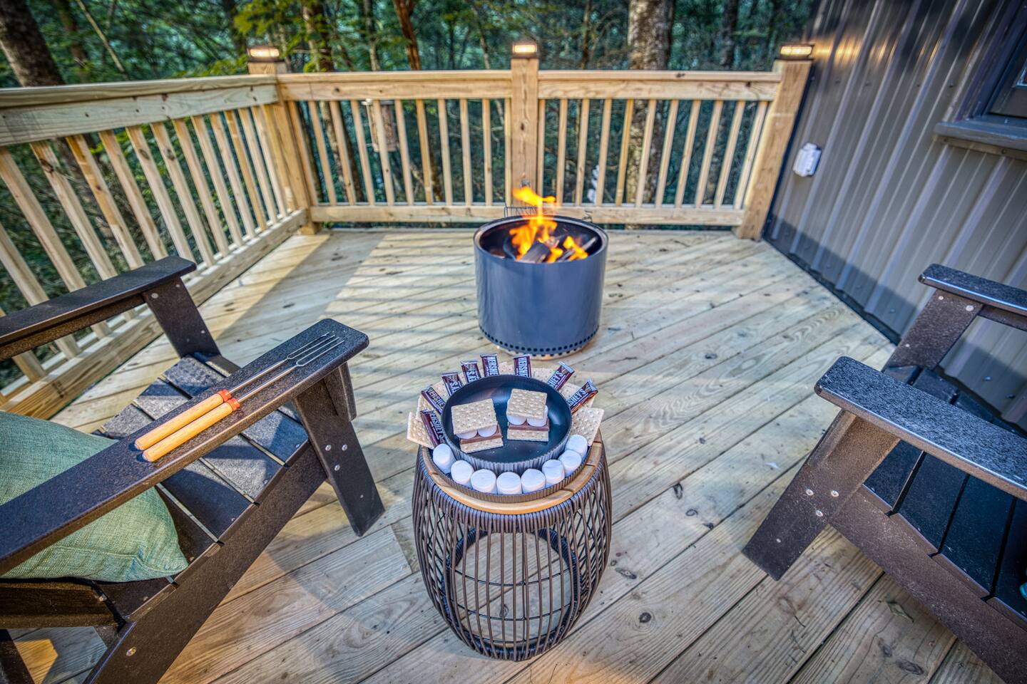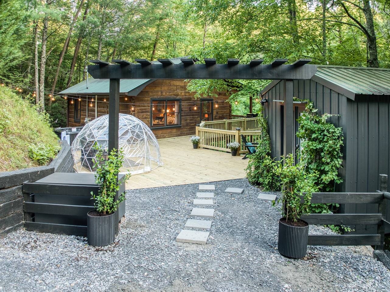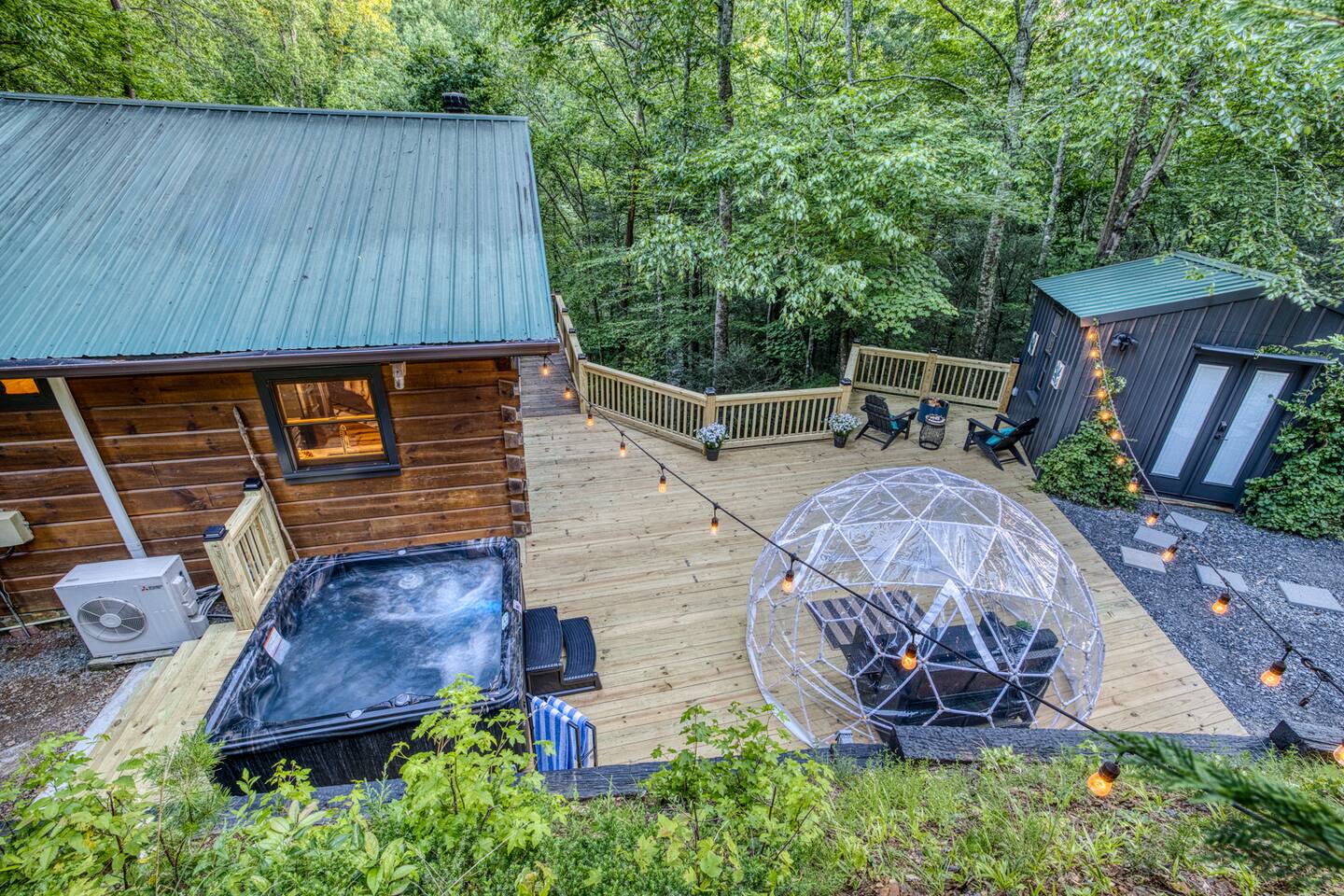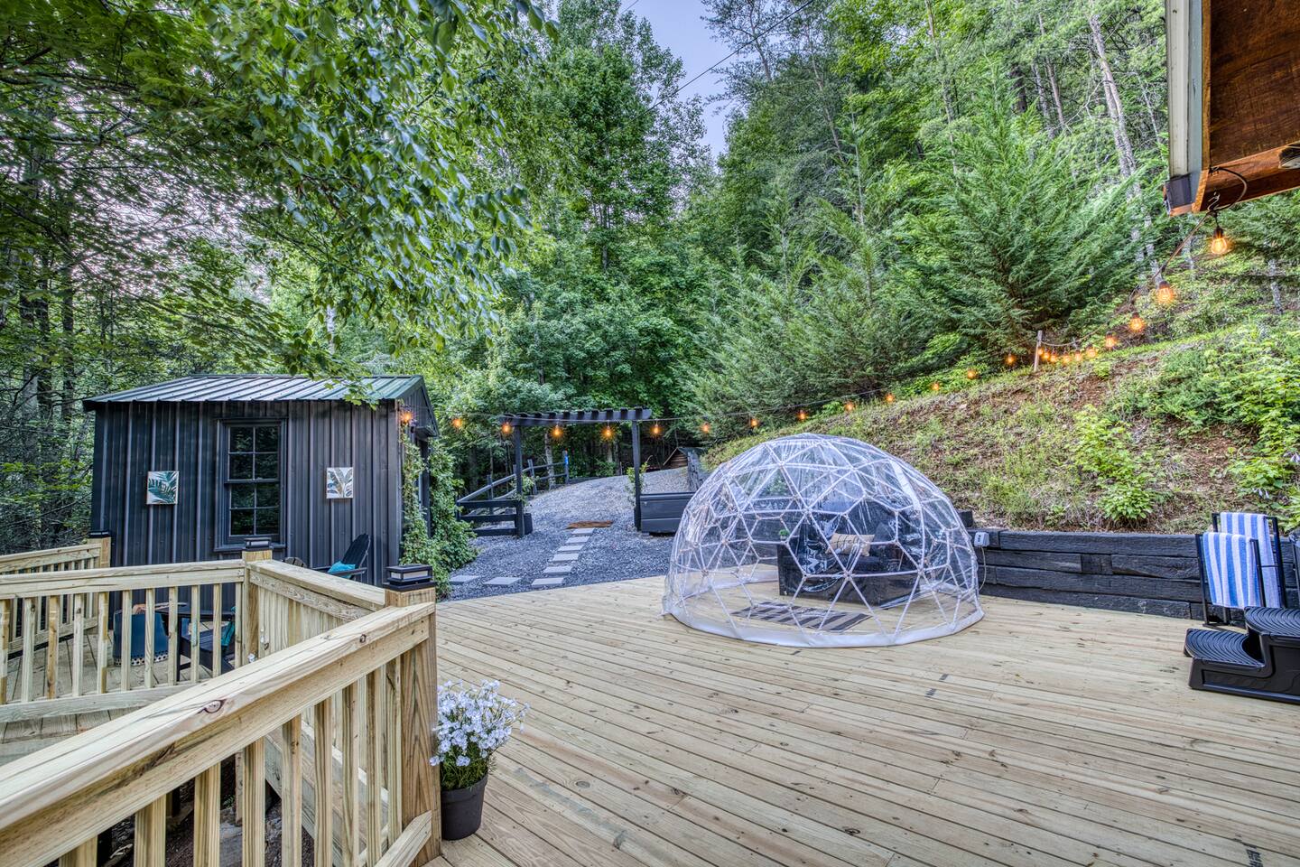 Spend your evenings stargazing from the glowing igloo dome, soaking in the private hot tub, or cuddled up by the crackling Solo Stove firepit. Let the soft murmur of the nearby creek, always audible and visible through the trees, lull you to sleep and gently greet you each morning. Sip coffee from a local roaster or tea on the front porch swing or in the rocking chairs as the forest wakes around you.