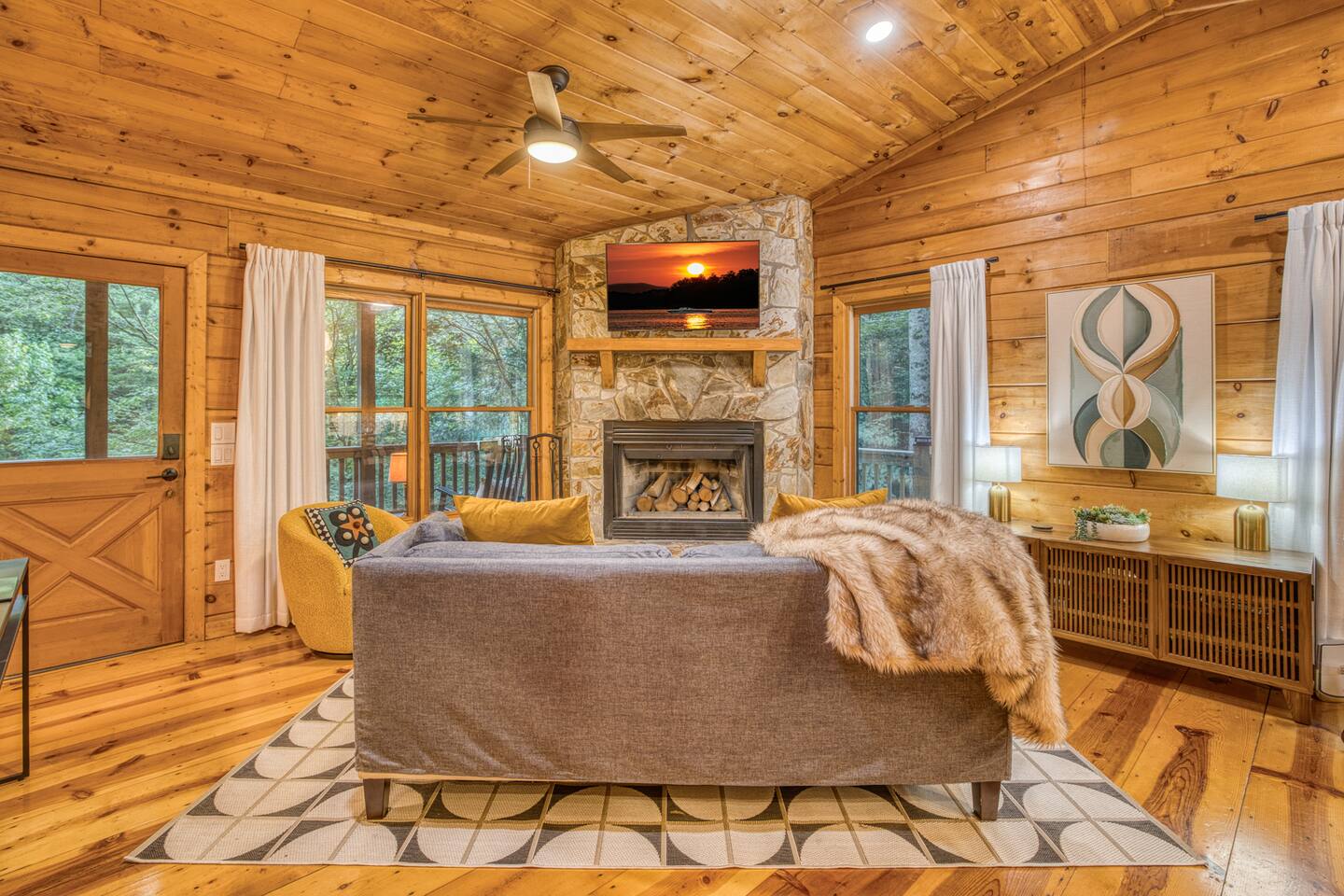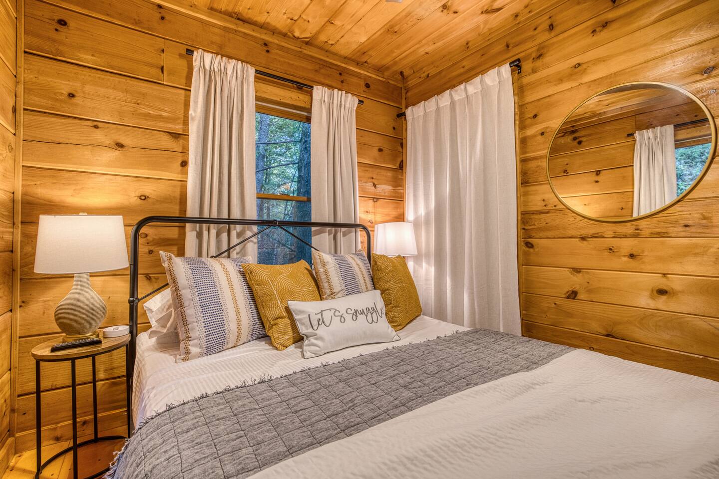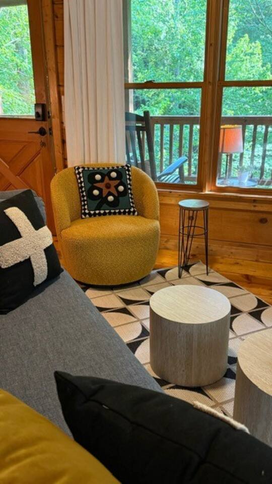 Whispering Waters is a renovated romantic, luxury cabin escape just 10 min from Blue Ridge & 15 min from Ellijay. Unwind in the hot tub, stargaze from the outdoor igloo, sit on the porch listening to the creek and birds, or cook outside on the gas grill. Refresh in the spa-like rain shower with Public Goods bath amenities and spa robes. With plush king and queen beds, a firepit, & upscale touches throughout, this retreat is perfect for couples seeking peace, connection, and indulgence in nature.