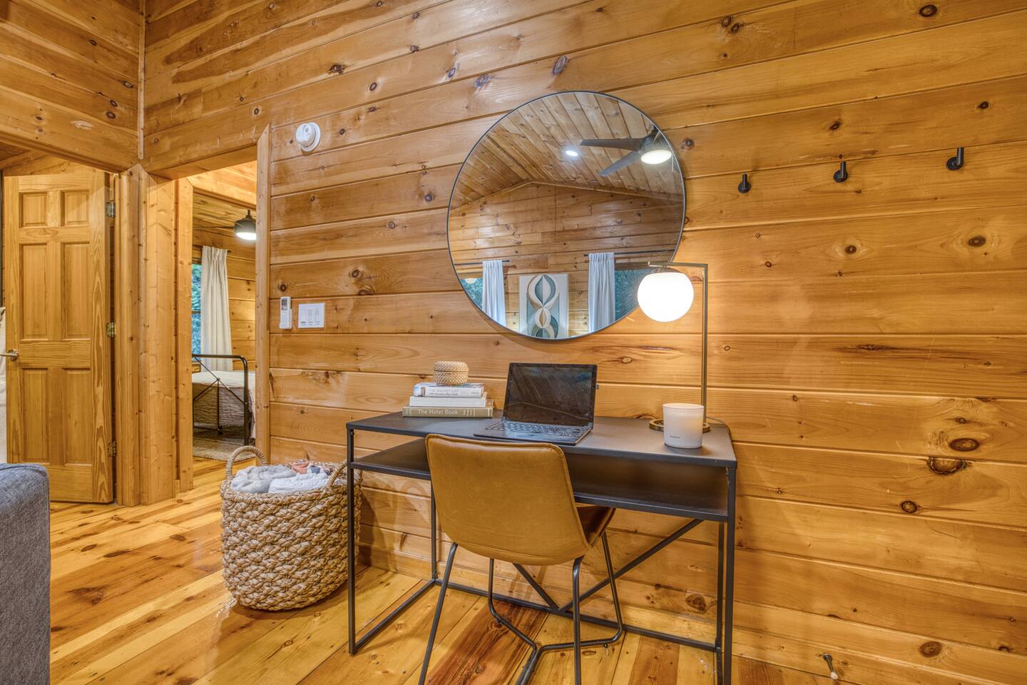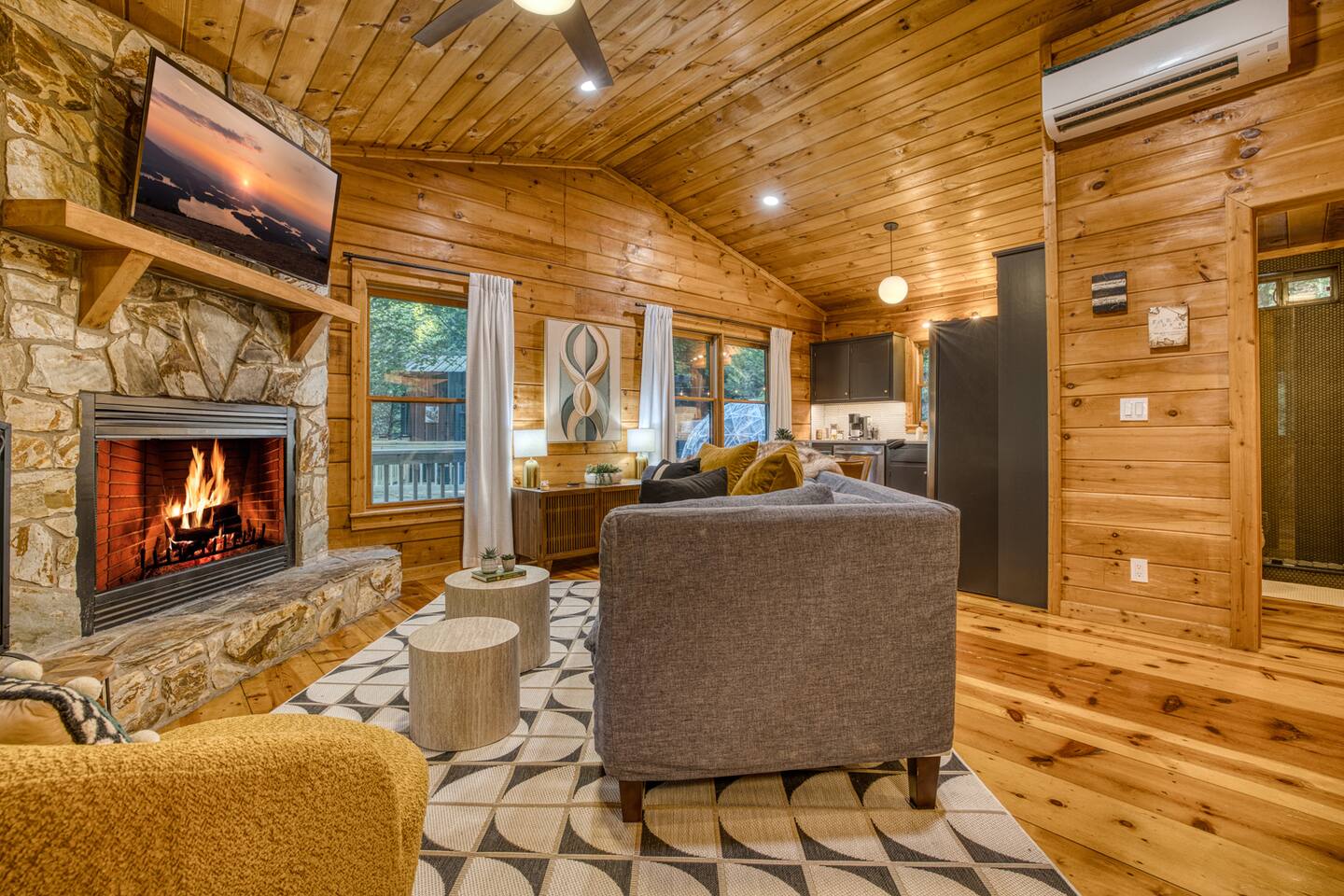The open-concept living area includes a rustic stone wood-burning fireplace, a 50” Smart Roku TV, mini-split A/C, and a dedicated work-from-home desk with a lamp, outlet, and high-speed Orbi Wi-Fi.