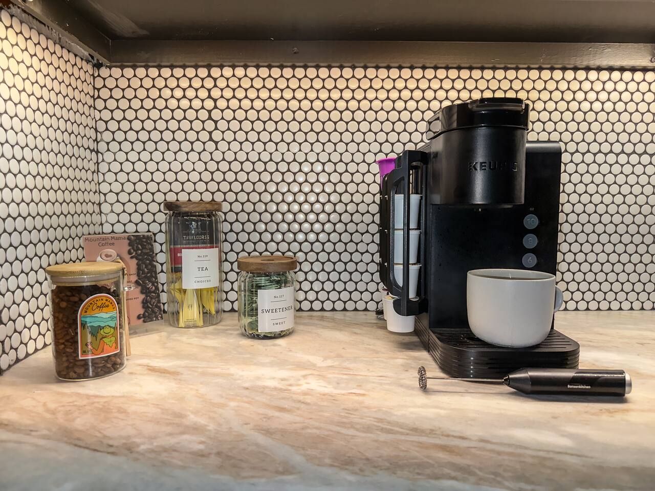 ☕ Coffee Setup: Keurig, drip coffee maker, grinder, reusable K-Cup, and milk frother
